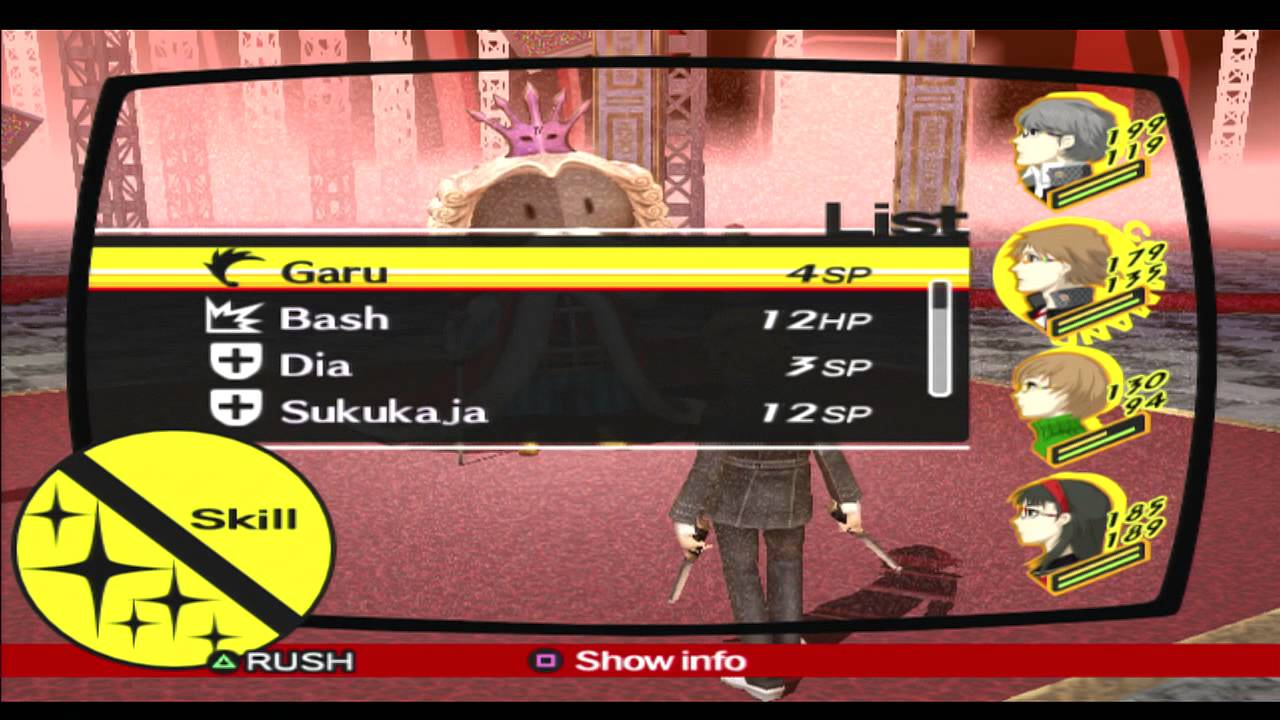 The gameplay is very similar to that of P3. You have your standard attack, skills, guard, persona switch, escape, the like. Once again, only the protagonist can be allowed to have multiple personas.Thankfully in P4 you don’t have to worry about tired or sick party members. That feature was taken out.